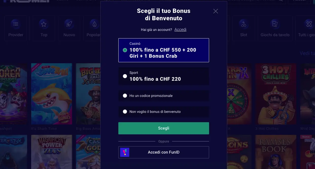 Bonus di benvenuto:100%/€500 + 200 Giri Gratuiti + 1 Bonus Crab